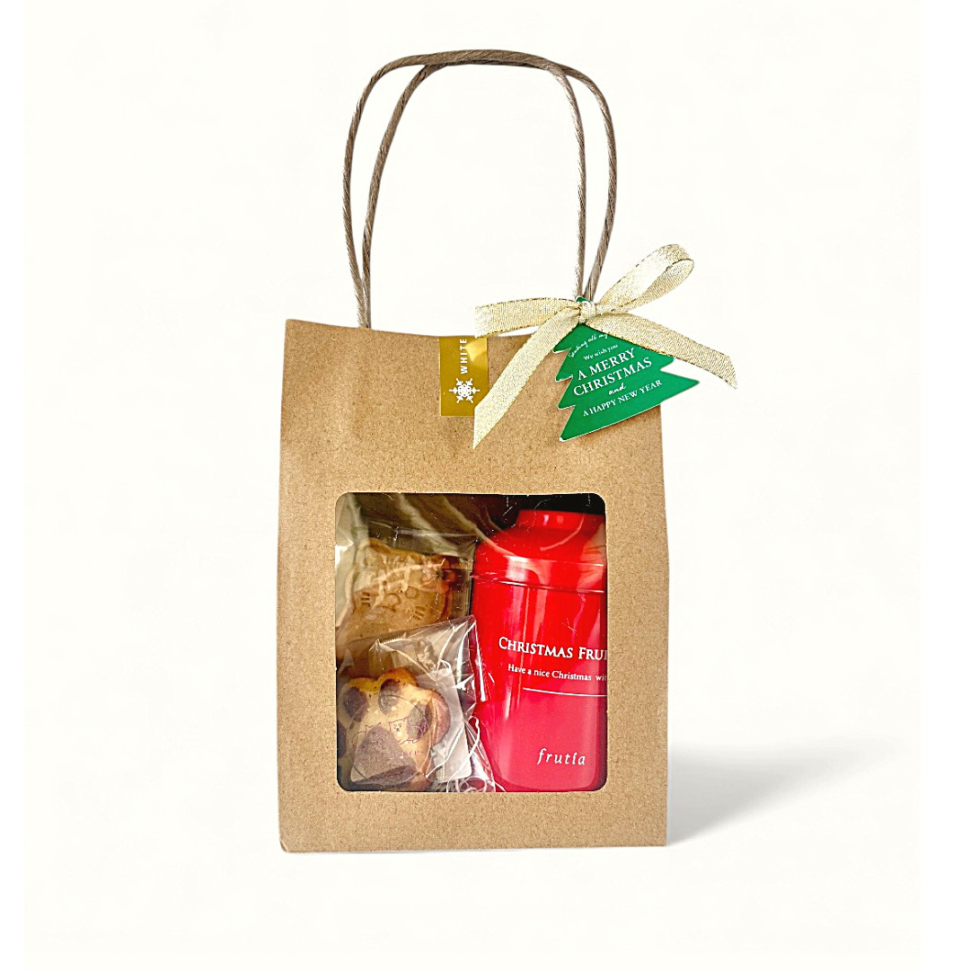 持ち手のある透明袋に、フルーティアのシール&リボンをお貼りした状態で、商品と一緒にお贈りいたします。